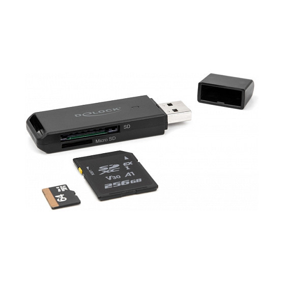 "DeLOCK Card Reader SuperSpeed USB 5 Gbps for SD and Micro SD memory cards. Compatible memory cards: MicroSD (TransFlash), SD, SDHC, SDXC, Product colour: Black, Data transfer rate: 5000 Mbit/s. Interface: USB. Width: 21 mm, Depth: 70 mm, Height: 9 mm. Quantity per pack: 1 pc(s), Package type: Box"\n"This card reader by Delock has two memory card slots and allows to read and write different SD, MMC and Micro SD memory cards. The card reader can be connected to a PC or laptop via the USB Type-A interface.
