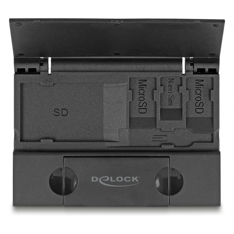 The handy box is suitable for storing and transporting memory cards. The cards are protected from damage and remain free from dirt and dust. A total of two Micro SD, one Nano Sim as well as one SD card can be stored. The box also has space for a SIM card needle."