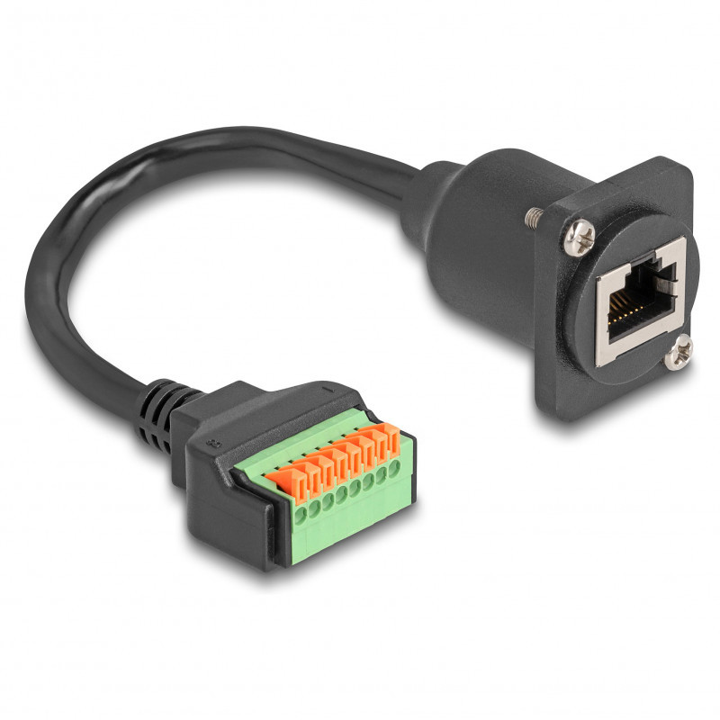 "DeLOCK D-Type Cable RJ45 jack to Terminal Block with push button Cat.5e black 30 cm. Connector 1: RJ45, Connector 2: 8-Pin Terminal Block, Cable length: 0.3 m. Product colour: Black"\n"This cable by Delock can be used e.g. for installation in a panel or housing with D-Type opening and can be used to extend and connect various network devices. Strands with stripped ends can be connected without tools via the terminal block with push-button."