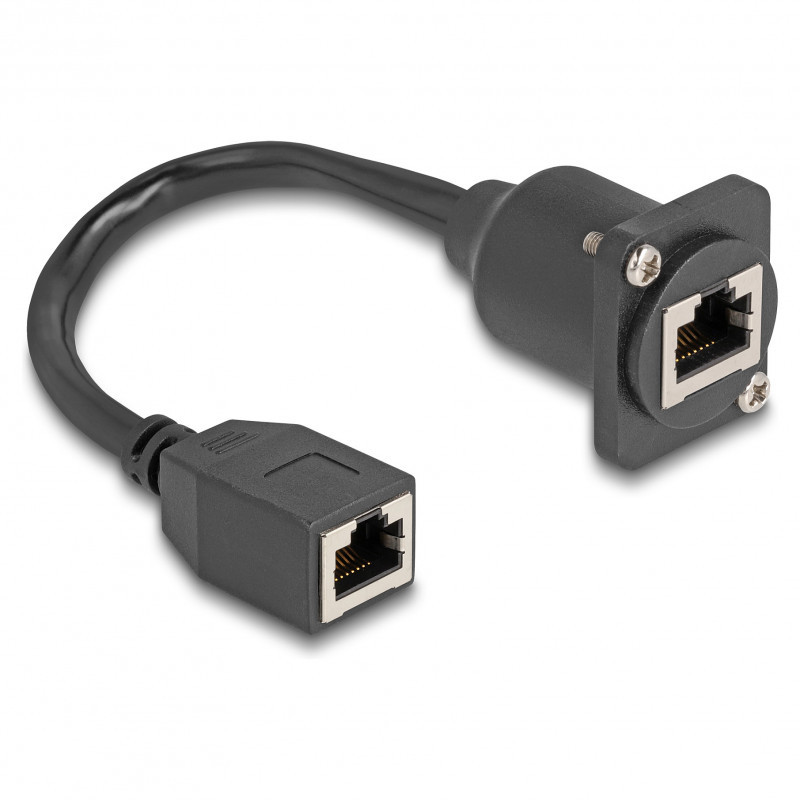 "DeLOCK D-Type RJ45 cable jack to jack Cat.5e black 20 cm. Cable length: 0.2 m, Cable standard: Cat5e, Cable shielding: S/UTP (STP), Connector 1: RJ-45, Connector 2: RJ-45, Product colour: Black"\n"This cable by Delock can be used e.g. for installation in a panel or housing with D-Type opening. It can also be used to extend and connect various network devices."