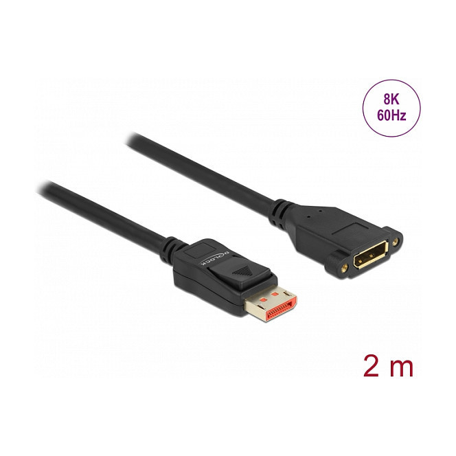 "DeLOCK DisplayPort extension cable panel-mount 8K 60 Hz 2 m. Cable length: 2 m, Connector 1: DisplayPort, Connector 2: DisplayPort. Cable diameter: 7 mm. Quantity per pack: 1 pc(s). Country of origin: China"\n"This cable by Delock can be used to extend a DisplayPort connection and to connect various devices. The female port can be attached with two screws, e.g. to a slot bracket, a cable duct or an enclosure with the corresponding opening. In this way, it is possible to install a DisplayPort connector in an easily accessible position."