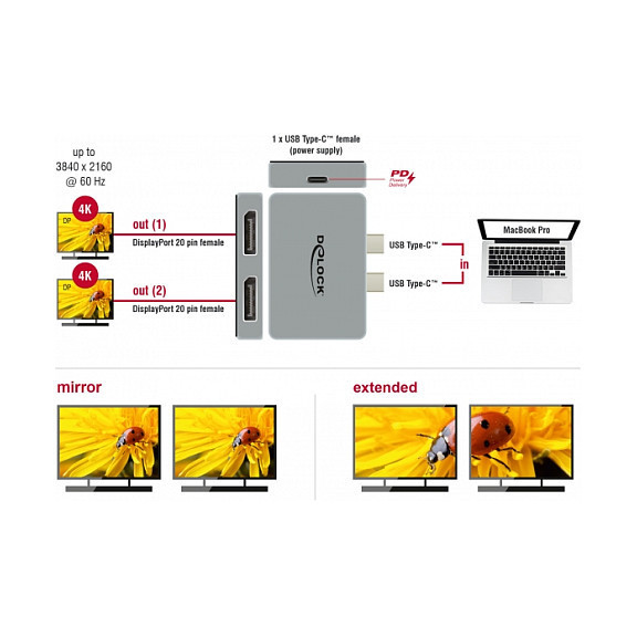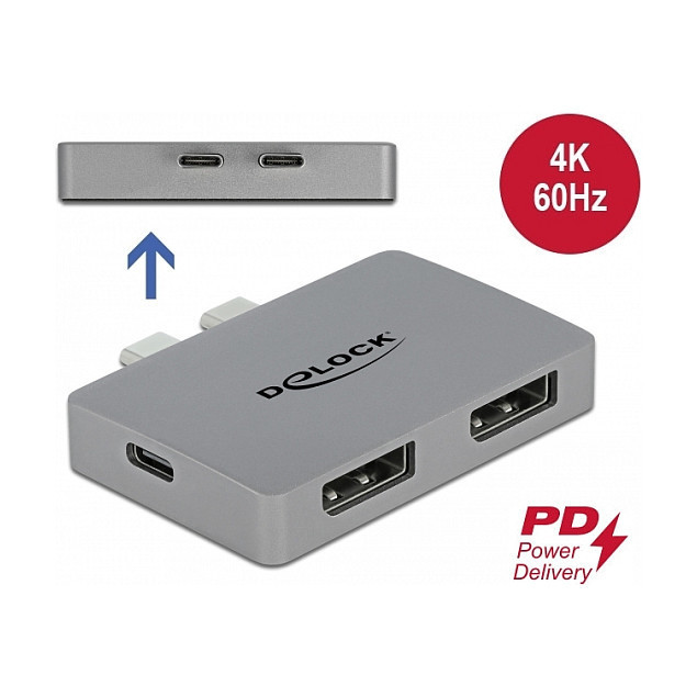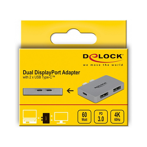 "DeLOCK Dual DisplayPort Adapter with 4K 60 Hz and PD 3.0 for MacBook. Maximum resolution: 3840 x 2160 pixels. Product colour: Grey. Width: 40 mm, Depth: 62 mm, Height: 11 mm. Package type: Box. Quantity per pack: 1 pc(s)"\n"This adapter by Delock can be connected to a MacBook with two adjacent Thunderbolt™ 3 ports, e.g. the MacBook Pro. Two monitors can be operated at the DisplayPort outputs with 4K 60 Hz simultaneously.