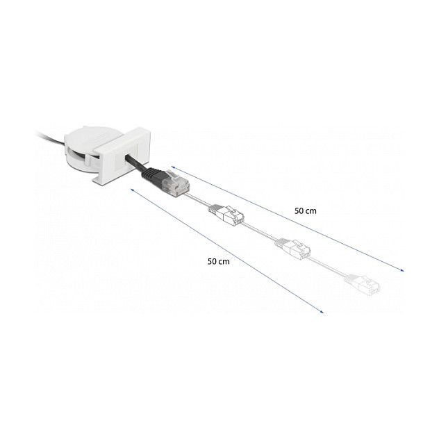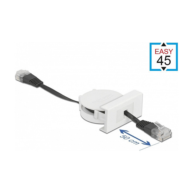 "DeLOCK Easy 45 Module Network Retractable Cable RJ45 Cat.5e black. Cable length: 0.62 m, Cable standard: Cat5e, Cable shielding: SF/UTP (S-FTP), Connector 1: RJ-45, Connector 2: RJ-45, Data transfer rate: 100 Mbit/s, Product colour: Black, White"\n"This network cable by Delock can be used to connect different networking devices, e.g. a laptop to an existing network. The simple snap-in mechanism ensures that the module is firmly in place and can be easily removed if necessary.