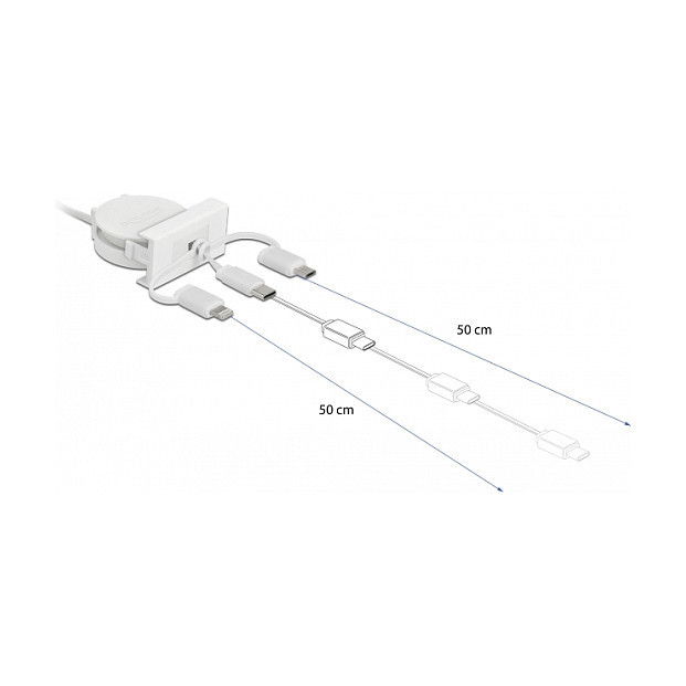 "DeLOCK Easy 45 Module USB 2.0 3 in 1 Retractable Cable USB Type-A to USB-C, Micro USB and Lightning white. Cable length: 0.5 m. Connector 1: USB A, Connector 2: USB C, USB version: USB 2.0, Maximum data transfer rate: 0.48 Gbit/s, Product colour: White"\n"This Easy 45 retractable cable by Delock can be connected to a PC, laptop or power source with USB-A connector and can be used to transfer data or charge various devices with USB Type Micro-B, USB Type-C or Lightning interface. The simple snap-in mechanism ensures that the module is firmly in place and can be easily removed if necessary.