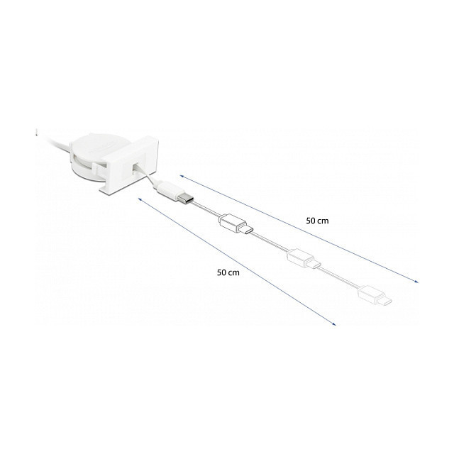 "DeLOCK Easy 45 Module USB 2.0 Retractable Cable USB Type-A to USB Type-C white. Cable length: 0.62 m. Connector 1: USB A, Connector 2: USB C, USB version: USB 2.0, Maximum data transfer rate: 0.48 Gbit/s, Product colour: White"\n"This Easy 45 retractable cable by Delock can be connected to a PC, laptop or power source with USB-A connector and can be used to transfer data or charge various devices with USB Type-C™ interface. The simple snap-in mechanism ensures that the module is firmly in place and can be easily removed if necessary.