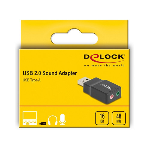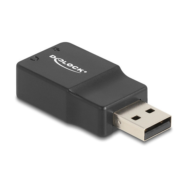 "DeLOCK External USB Sound Card with USB-A male to 2 x 3.5 mm Stereo jack Plug & Play audio adapter black. Connector 1: USB 2.0 Type-A, Connector 2: 2 x 3.5 mm 3 pin. Product colour: Black"\n"Description