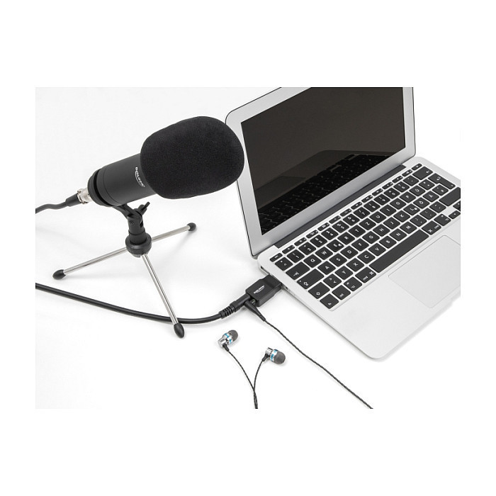 At the 3.5 mm jack microphone input of this adapter, for example, a PC microphone can be connected and therefore high-quality audio recordings with a maximum sampling rate of 16 bit / 48 kHz can be created. This makes the adapter ideal for video chats, streaming and gaming.