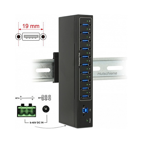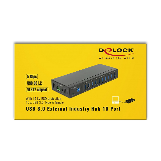 "DeLOCK 63919. Host interface: USB 3.2 Gen 1 (3.1 Gen 1) Micro-B, Hub interfaces: USB 3.2 Gen 1 (3.1 Gen 1) Type-A. Data transfer rate: 5000 Mbit/s, Product colour: Black, Housing material: Metal. Windows operating systems supported: Windows 10, Windows 7, Windows 8.1, Mac operating systems supported: Mac OS X 10.9 Mavericks. Width: 80 mm, Depth: 202 mm, Height: 32 mm. Package type: Box"\n"This solid industry capable USB hub by Delock can be connected to a computer via the USB Type-A interface. It expands the computer by ten USB Type-A connectors. If necessary, an optional power supply or an optional power cable can be connected to the power socket."
