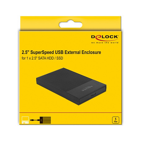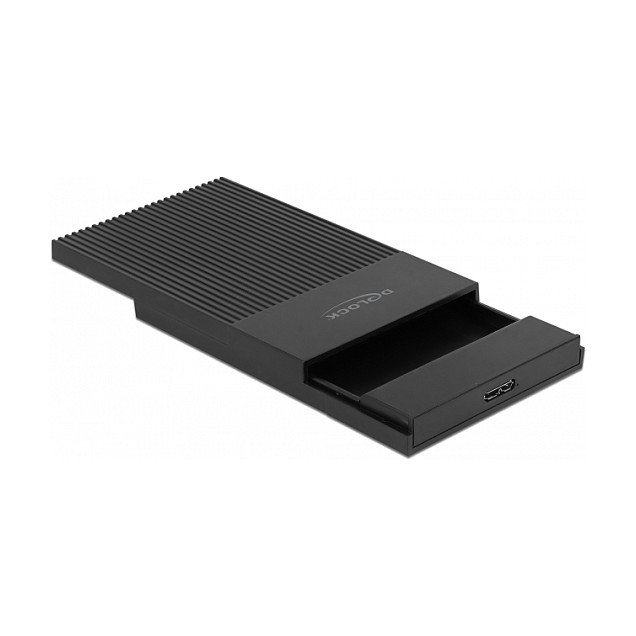"DeLOCK External Enclosure for 2.5″ SATA HDD / SSD with SuperSpeed USB Type Micro-B female - tool free. Product type: HDD/SSD enclosure. Number of storage drives supported: 1, Storage drive size: 2.5"", Supported storage drive interfaces: Serial ATA III. Data transfer rate: 5 Gbit/s. Product colour: Black. USB connector type: Micro-USB B"\n"This plastic enclosure by Delock can be used for the installation of a 2.5″ SATA hard drive or SSD. Despite the slim design, hard disks up to a height of 9.5 mm can be installed. The included USB Type Micro-B to USB Type-A cable allows the connection to a free USB Type-A female port.