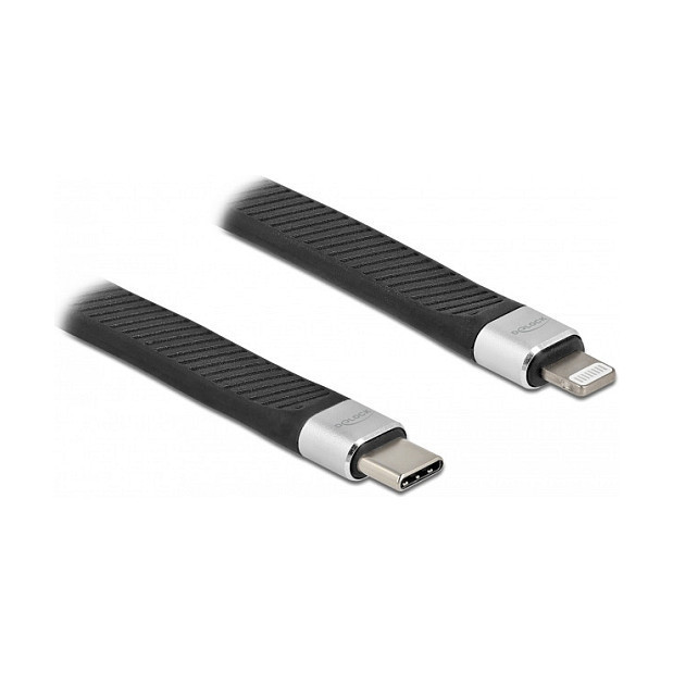 "DeLOCK FPC Flat Ribbon Cable USB Type-C to Lightning for iPhone, iPad and iPod 13 cm. Cable length: 0.13 m, Connector 1: Lightning, Connector 2: USB C. Output current (max): 3 A. Cable diameter: 3 mm. Quantity per pack: 1 pc(s), Package type: Polybag"\n"This USB data and charging cable by Delock can be used to connect an iPhone™, iPad™ or iPod™ to a computer or laptop with USB Type-C™ or Thunderbolt™ 3 port, e.g. to a MacBook. The device is charged and data can be transferred.