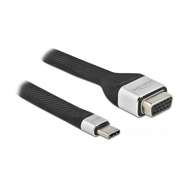 "DeLOCK FPC Flat Ribbon Cable USB Type-C to VGA (DP Alt Mode) 13 cm. Cable length: 0.13 m, Connector 1: USB Type-C, Connector 2: VGA (D-Sub). Cable diameter: 3 mm. Quantity per pack: 1 pc(s)"\n"This cable by Delock enables the connection of a VGA monitor to a PC or laptop with USB-C™ or Thunderbolt™ 3 port, such as a MacBook or a Chromebook. The interface has to support the DisplayPort Alternate Mode.