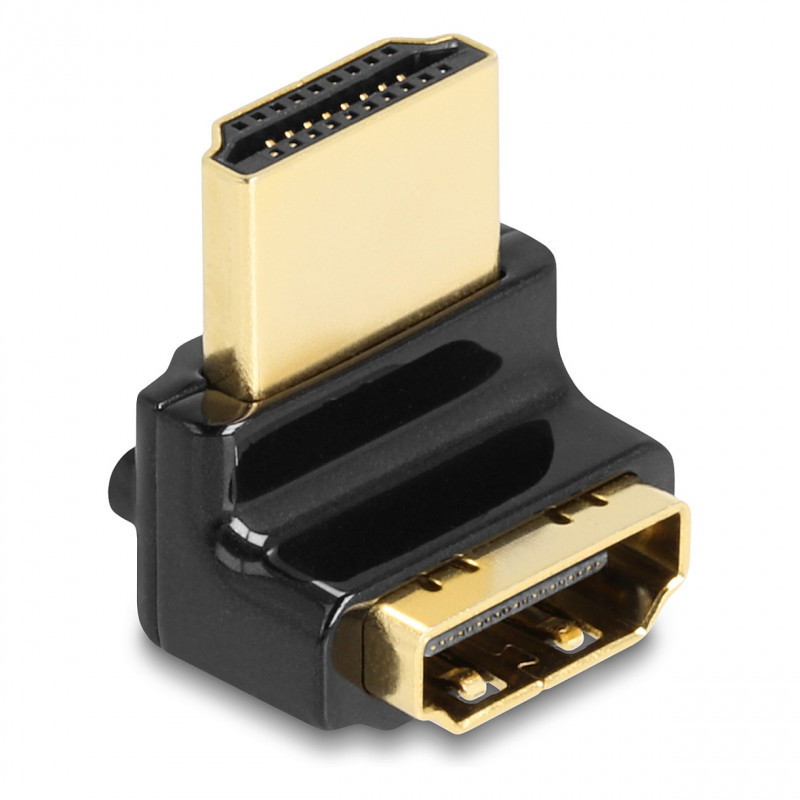 "DeLOCK HDMI Adapter male to female 90° upwards angled 8K 60 Hz metal. Connector 1: HDMI, Connector 2: HDMI, Connector contacts plating: Gold. Product colour: Black"\n"With this HDMI adapter by Delock, the port of an HDMI device, such as a flat screen, can be angled by 90°. This makes it easy to connect an HDMI cable if the existing HDMI socket is difficult to access."