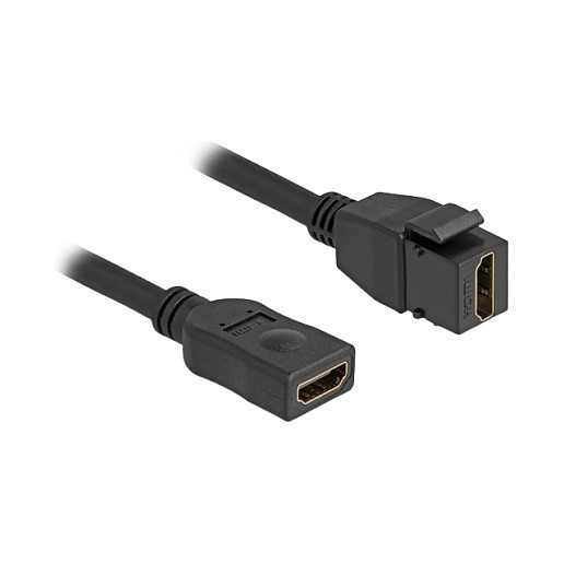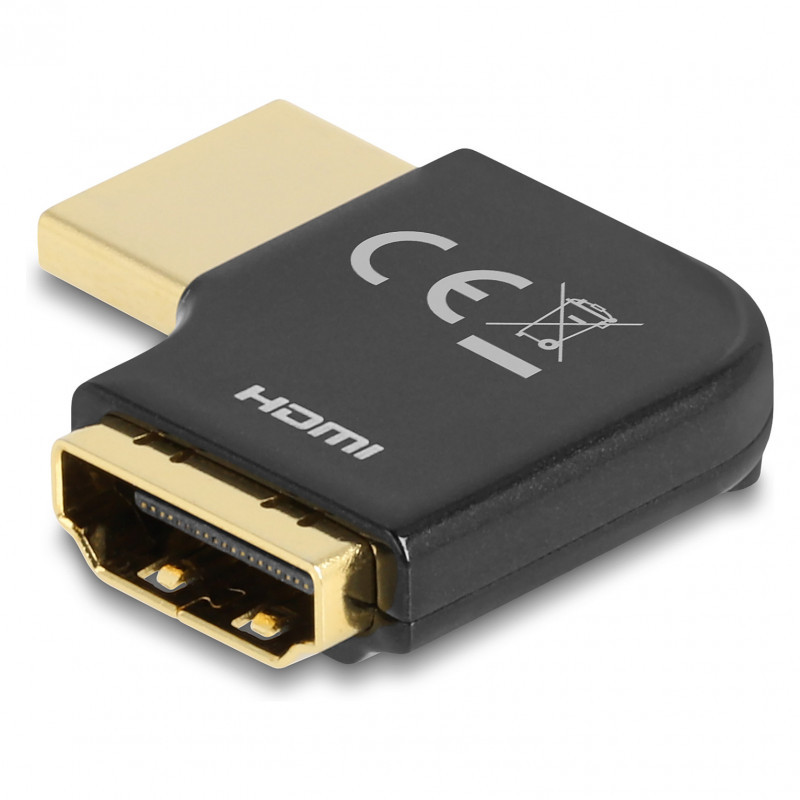 "DeLOCK HDMI Adapter male to female 90° right angled 8K 60 Hz metal. Connector 1: HDMI, Connector 2: HDMI, Connector contacts plating: Gold. Product colour: Black"\n"With this HDMI adapter by Delock, the port of an HDMI device, such as a flat screen, can be angled by 90°. This makes it easy to connect an HDMI cable if the existing HDMI socket is difficult to access."