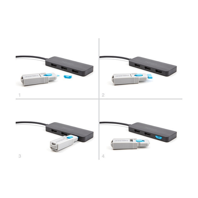 With this HDMI port blocker set by Delock HDMI ports can be secured against unauthorized access. The port blockers housed inside the tool are placed on the tip, pushed into the HDMI port and block the HDMI socket. A total of 4 HDMI ports can be blocked with the set. Access by cables or similar to the port are then no longer possible. To open the lock, the included tool is required.