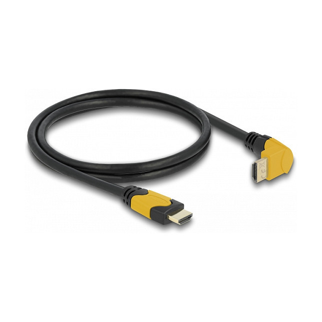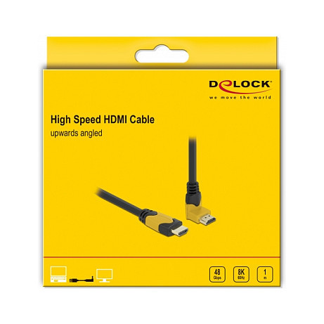 "DeLOCK High Speed HDMI cable male straight to male 90° upwards angled 48 Gbps 8K 60 Hz 1 m. Cable length: 1 m, Connector 1: HDMI Type A (Standard), Connector 1 gender: Male, Connector 2: HDMI Type A (Standard), Connector 2 gender: Male, Connector contacts plating: Gold, 3D, Data transfer rate: 48 Gbit/s, Product colour: Black, Yellow"\n"This high-quality High Speed HDMI cable by Delock can be used to connect devices with an HDMI interface, such as televisions, Blu-ray players, monitors or projectors. By supporting a maximum bandwidth of 48 Gbps, content can be displayed in 8K Ultra HD (7680 x 4320 @ 60 Hz) resolution.