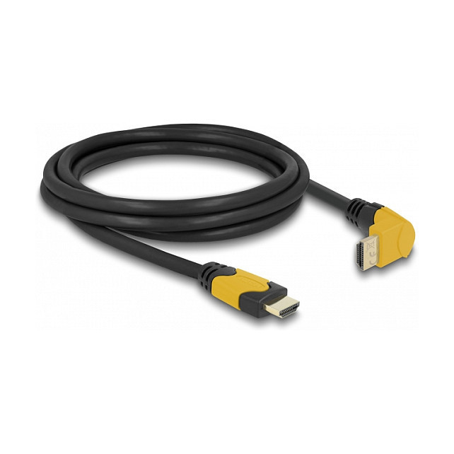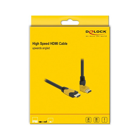 "DeLOCK High Speed HDMI cable male straight to male 90° upwards angled 48 Gbps 8K 60 Hz 2 m. Cable length: 2 m, Connector 1: HDMI Type A (Standard), Connector 1 gender: Male, Connector 2: HDMI Type A (Standard), Connector 2 gender: Male, Connector contacts plating: Gold, 3D, Data transfer rate: 48 Gbit/s, Product colour: Black, Yellow"\n"This high-quality High Speed HDMI cable by Delock can be used to connect devices with an HDMI interface, such as televisions, Blu-ray players, monitors or projectors. By supporting a maximum bandwidth of 48 Gbps, content can be displayed in 8K Ultra HD (7680 x 4320 @ 60 Hz) resolution.