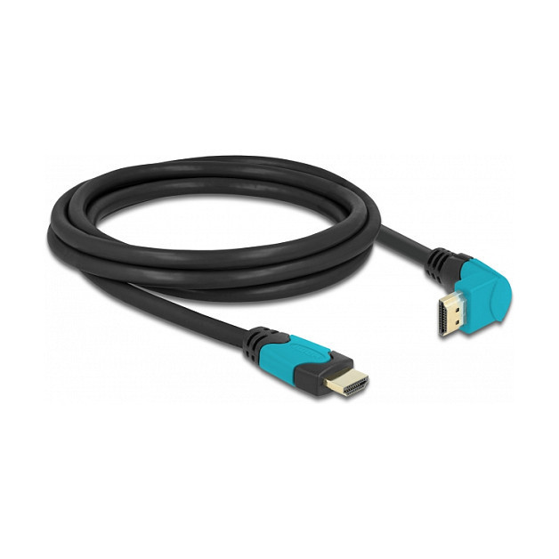 "DeLOCK High Speed HDMI cable male straight to male 90° downwards angled 48 Gbps 8K 60 Hz 2 m. Cable length: 2 m, Connector 1: HDMI Type A (Standard), Connector 1 gender: Male, Connector 2: HDMI Type A (Standard), Connector 2 gender: Male, Connector contacts plating: Gold, 3D, Data transfer rate: 48 Gbit/s, Product colour: Black, Blue"\n"This high-quality High Speed HDMI cable by Delock can be used to connect devices with an HDMI interface, such as televisions, Blu-ray players, monitors or projectors. By supporting a maximum bandwidth of 48 Gbps, content can be displayed in 8K Ultra HD (7680 x 4320 @ 60 Hz) resolution.