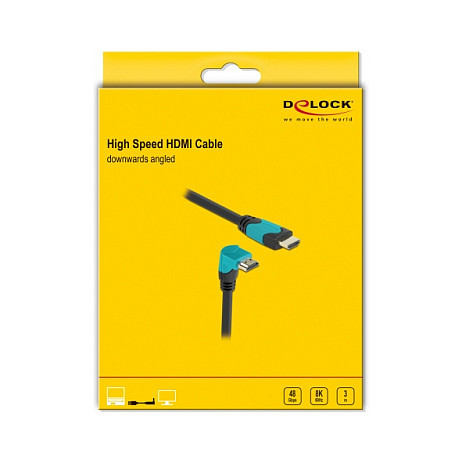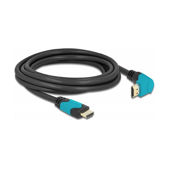 "DeLOCK High Speed HDMI cable male straight to male 90° downwards angled 48 Gbps 8K 60 Hz 3 m. Cable length: 3 m, Connector 1: HDMI Type A (Standard), Connector 1 gender: Male, Connector 2: HDMI Type A (Standard), Connector 2 gender: Male, Connector contacts plating: Gold, 3D, Data transfer rate: 48 Gbit/s, Product colour: Black, Blue"\n"This high-quality High Speed HDMI cable by Delock can be used to connect devices with an HDMI interface, such as televisions, Blu-ray players, monitors or projectors. By supporting a maximum bandwidth of 48 Gbps, content can be displayed in 8K Ultra HD (7680 x 4320 @ 60 Hz) resolution.