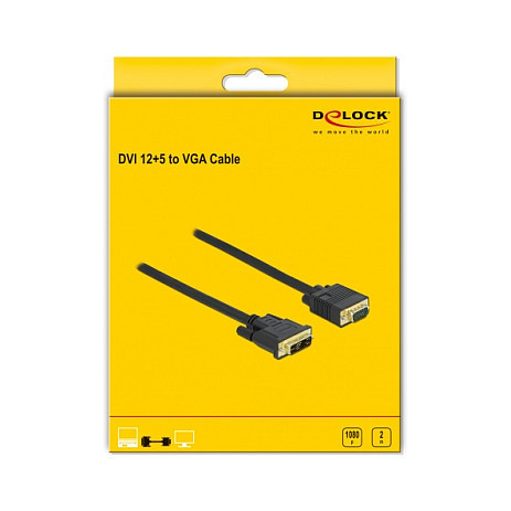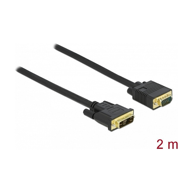 "DeLOCK Cable DVI 12+5 male to VGA male 2 m. Cable length: 2 m, Connector 1: DVI, Connector 2: VGA (D-Sub). Cable diameter: 8 mm. Package type: Box. Quantity per pack: 1 pc(s)"\n"This DVI to VGA cable by Delock supports the transfer of analog video signals and can be used to connect a VGA monitor or a projector to the DVI interface of a PC or laptop."
