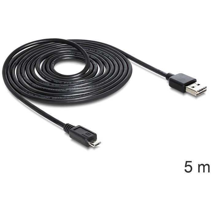 "DeLOCK EASY-USB 2.0-A - USB 2.0 micro-B, 5m. Cable length: 5 m. Connector 1: USB A, Connector 2: Micro-USB B, USB version: USB 2.0, Connector gender: Male/Male, Maximum data transfer rate: 0.48 Gbit/s, Connector contacts plating: Gold, Product colour: Black"\n"This cable by Delock with EASY-USB male can be plugged into the USB A female port in both directions. Thus the male port can be used both-sided and make the plug in easily."