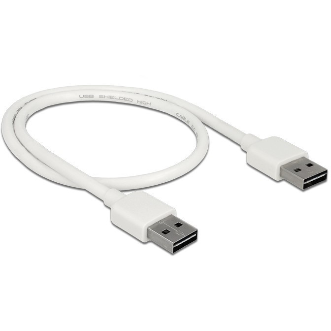 "DeLOCK 85192. Cable length: 0.5 m. Connector 1: USB A, Connector 2: USB A, USB version: USB 2.0, Connector gender: Male/Male, Maximum data transfer rate: 0.48 Gbit/s, Connector contacts plating: Gold, Product colour: White"\n"This cable by Delock with EASY-USB male can be plugged into the USB-A female port in both directions. Thus the male port can be used both-sided and make the plug in easily."