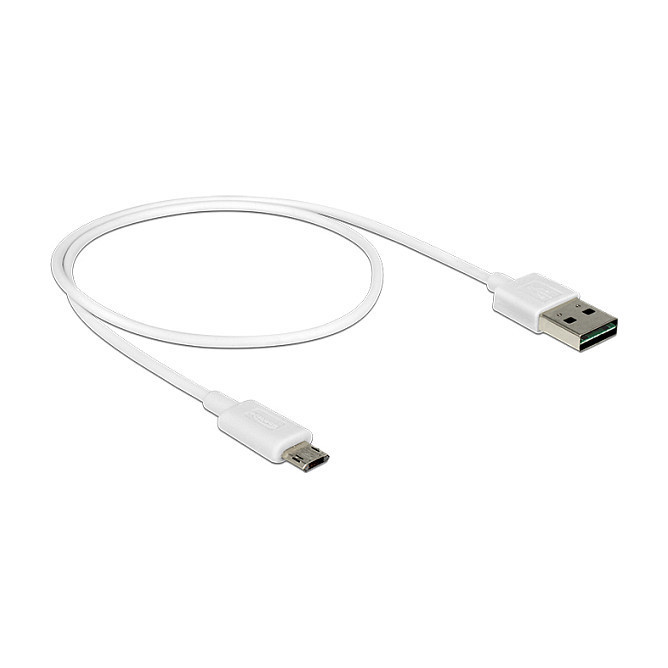 "DeLOCK 84806. Cable length: 0.5 m. Connector 1: USB A, Connector 2: Micro-USB B, USB version: USB 2.0, Maximum data transfer rate: 0.48 Gbit/s, Connector contacts plating: Gold, Product colour: White"\n"This cable by Delock with EASY-USB Type-A male and EASY-USB Type Micro-B male can be plugged into the appropriated USB female port in both directions. Thus the male connector can be used both-sided which makes the plug in easier."