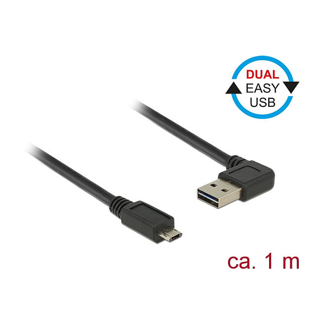 "DeLOCK 85165. Cable length: 1 m. Connector 1: USB A, Connector 2: Micro-USB B, USB version: USB 2.0, Connector contacts plating: Gold, Product colour: Black"\n"This cable by Delock with EASY-USB Type-A male and EASY-USB Type Micro-B male can be plugged into the appropriated USB female port in both directions. Thus the male connector can be used both-sided which makes the plug in easier."
