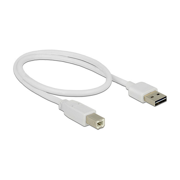 "DeLOCK 0.5m, USB2.0-A/USB2.0-B. Cable length: 0.5 m. Connector 1: USB A, Connector 2: USB B, USB version: USB 2.0, Connector gender: Male/Male, Maximum data transfer rate: 0.48 Gbit/s, Connector contacts plating: Gold, Product colour: White"\n"This cable by Delock with EASY-USB male can be plugged into the USB-A female port in both directions. Thus the male port can be used both-sided and make the plug in easily."
