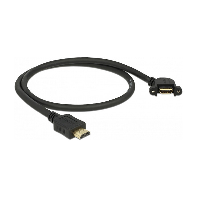 "DeLOCK 85467. Cable length: 0.5 m, Connector 1: HDMI Type A (Standard), Connector 1 gender: Male, Connector 2: HDMI Type A (Standard), Connector 2 gender: Female, Connector contacts plating: Gold, Maximum resolution: 3840 x 2160 pixels, Data transfer rate: 10.2 Gbit/s, Product colour: Black"\n"This cable by Delock can be used to extend an HDMI connection and to connect various devices. The female port can be attached with two screws, e.g. to a slot bracket, a cable duct or an enclosure with the corresponding opening. In this way, it is possible to install a HDMI connector in an easily accessible position."
