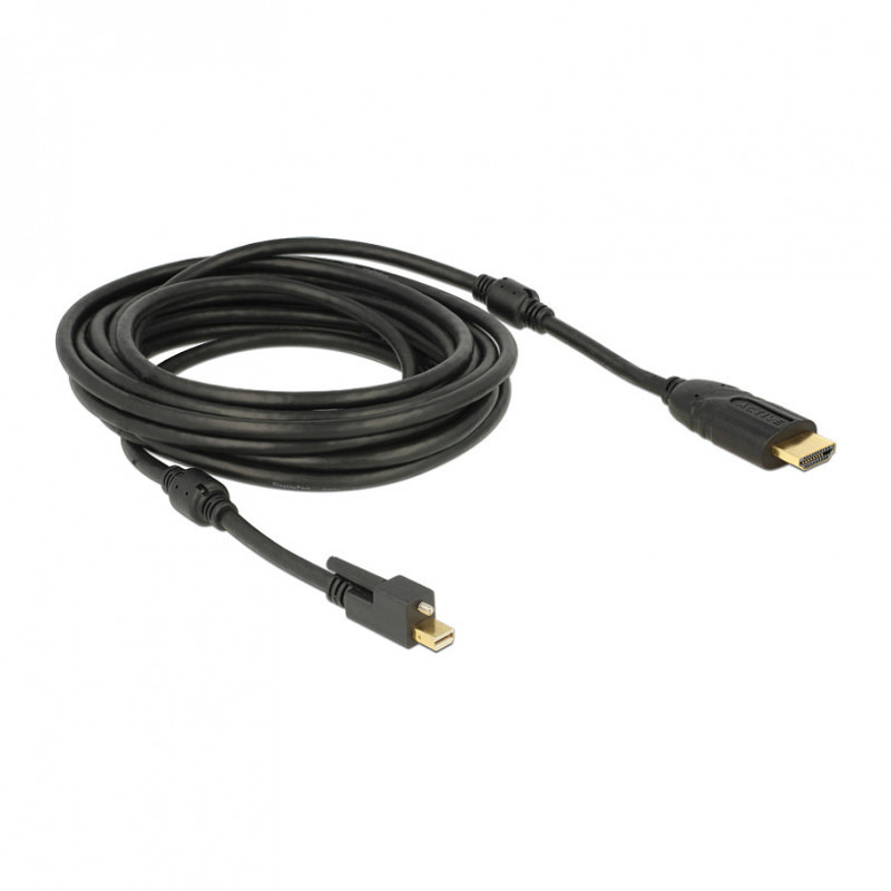 "DeLOCK 83732. Cable length: 5 m, Connector 1: Mini DisplayPort, Connector 2: HDMI. Cable diameter: 5.5 mm. Package type: Polybag"\n"This cable enables you to connect a HDMI monitor through a free mini Displayport interface. The cable supports a resolution up to Ultra HD (4K) and is backward compatible to Full-HD 1080p. The screw of the mini Displayport connector secures the connection and prevents accidental unplugging of the cable."