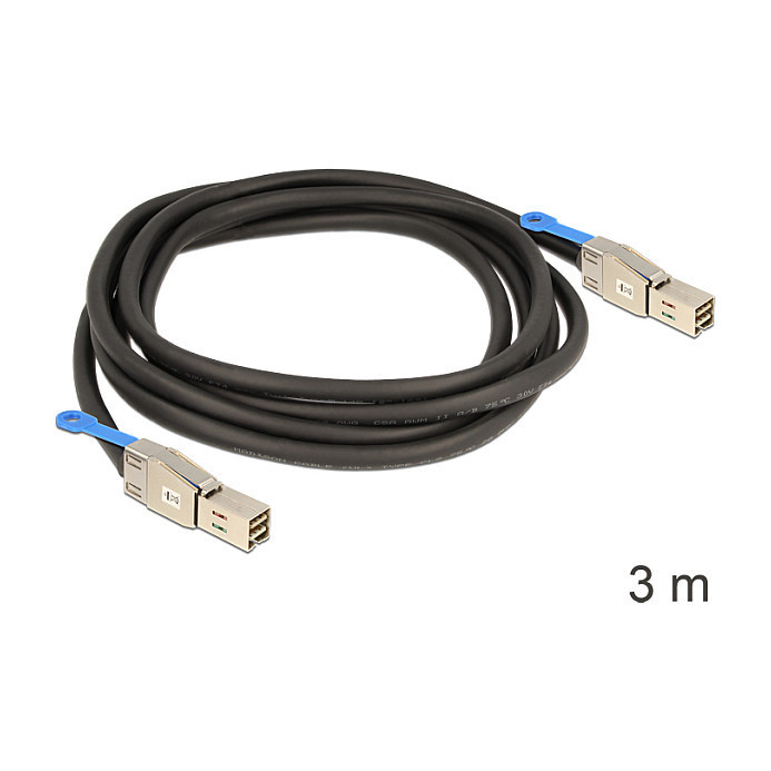 "DeLOCK 83396. Cable length: 3 m, Connector 1: Mini SAS HD x 4 SFF 8644, Connector 2: Mini SAS HD x 4 SFF 8644"\n"This SAS cable by Delock enables you to connect e.g. one drive to a Mini SAS HD x 4 SFF 8644 controller."