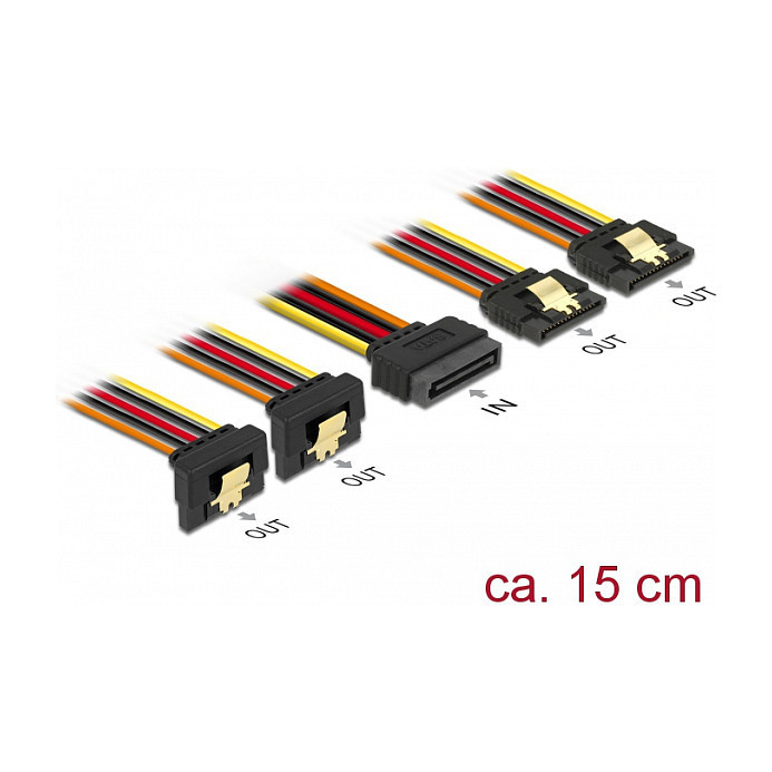 "DeLOCK 60150. Connector 1: 4 x SATA 15-pin, Connector 2: SATA 15-pin, Cable length: 0.15 m. Package type: Polybag"\n"This cable by Delock can supply power for four SATA devices via one free SATA 15 pin power connector of the power supply. The metal clips on the receptacles and the clearance on the plug ensure that the cable reliably clicks into place."