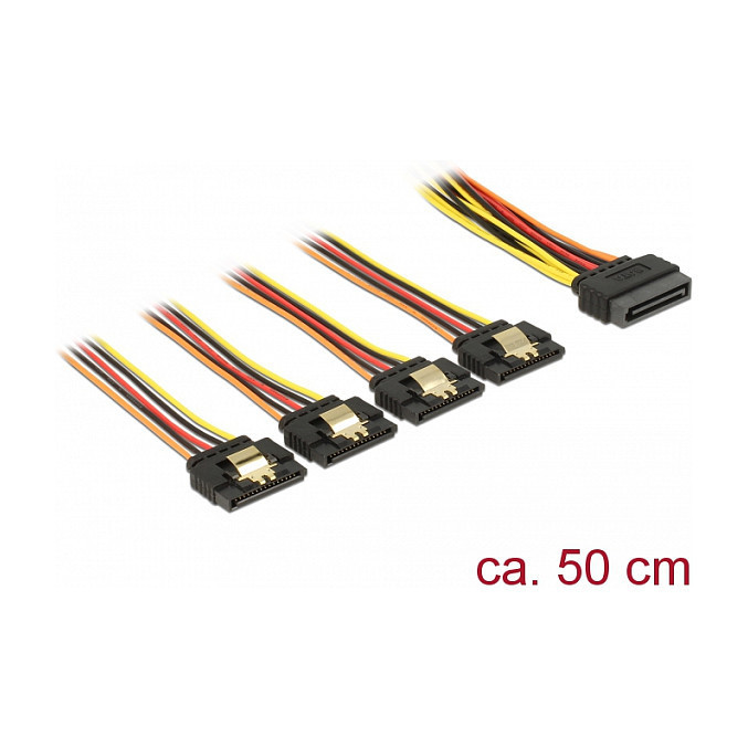 "DeLOCK 60158. Cable length: 0.5 m, Cable type: SATA I, Connector 1: SATA 15-pin. Package type: Polybag"\n"This cable by Delock can supply power for four SATA devices via one free SATA 15 pin power connector of the power supply. The metal clips on the receptacles and the clearance on the plug ensure that the cable reliably clicks into place."