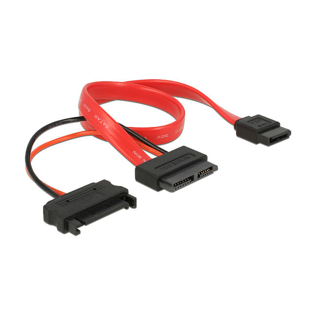 "DeLOCK 0.3m SATA. Cable type: SATA I, Connector gender: Female/Female, Product colour: Red. Package type: Polybag"\n"This Slim SATA cable by Delock can be used for connecting devices with Slim SATA port, e.g. CD / DVD drives."