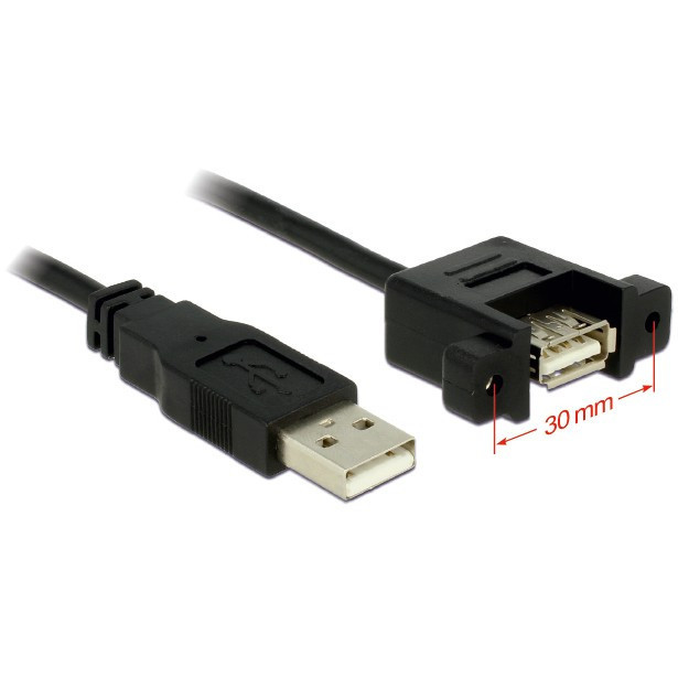 "DeLOCK 1m 2xUSB2.0-A. Cable length: 1 m. Connector 1: USB A, Connector 2: USB A, USB version: USB 2.0, Connector gender: Male/Female, Maximum data transfer rate: 0.48 Gbit/s, Product colour: Black"\n"This cable enables you to extend a USB 2.0 connection and can be used to connect various devices. The female port can be attached with two screws, e.g. to a slot bracket, a cable duct or an enclosure with the corresponding opening. This can be used to install an USB connector on an easily accessible position."
