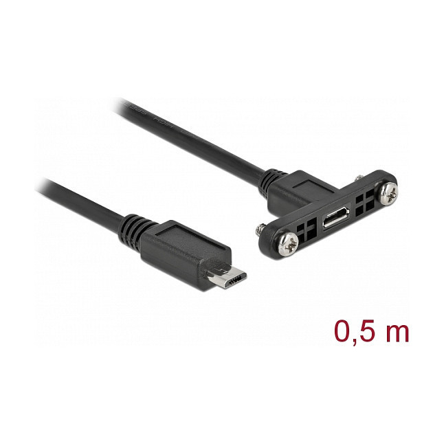 "DeLOCK Cable USB 2.0 Micro-B female panel-mount > USB 2.0 Micro-B male 0.5 m. Cable length: 0.5 m. Connector 1: Micro-USB B, Connector 2: Micro-USB B, USB version: USB 2.0, Maximum data transfer rate: 0.48 Gbit/s, Product colour: Black"\n"This cable by Delock can be used to extend a USB 2.0 connection and to connect various devices. The female ports can be attached with two screws, e.g. to a slot bracket, a cable duct or an enclosure with the corresponding opening. In this way, it is possible to install a USB connector in an easily accessible position."