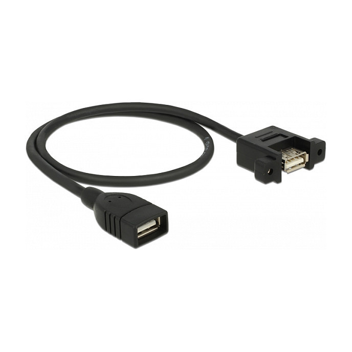 "DeLOCK 85459. Cable length: 0.5 m. Connector 1: USB A, Connector 2: USB A, USB version: USB 2.0, Maximum data transfer rate: 0.48 Gbit/s, Connector contacts plating: Gold, Product colour: Black"\n"This cable by Delock can be used to extend an USB connection and to connect various devices. The female port can be attached with two screws, e.g. to a slot bracket, a cable duct or an enclosure with the corresponding opening. In this way, it is possible to install a USB connector in an easily accessible position."