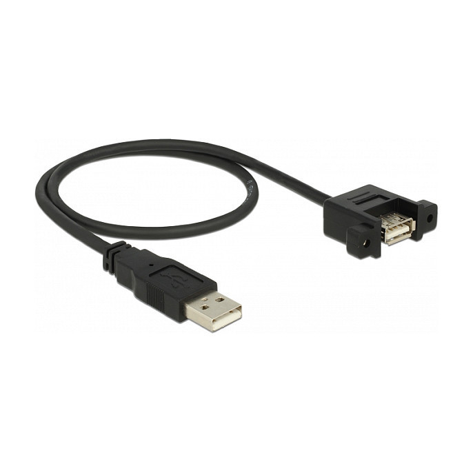 "DeLOCK 85461. Cable length: 0.5 m. Connector 1: USB A, Connector 2: USB A, USB version: USB 2.0, Maximum data transfer rate: 0.48 Gbit/s, Connector contacts plating: Gold, Product colour: Black"\n"This cable by Delock can be used to extend an USB connection and to connect various devices. The female port can be attached with two screws, e.g. to a slot bracket, a cable duct or an enclosure with the corresponding opening. In this way, it is possible to install a USB connector in an easily accessible position."