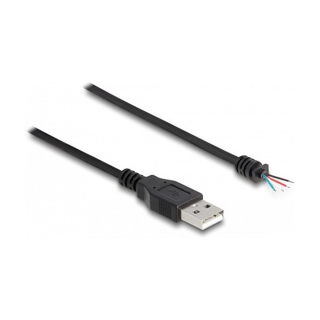 "DeLOCK Cable USB 2.0 Type-A male to 4 x open wires 1 m black. Cable length: 1 m. Connector 1: USB A, USB version: USB 2.0, Product colour: Black"\n"This USB cable with open wires by Delock is suitable as a connection cable and can be used for various industrial applications but also for hobby and DIY."
