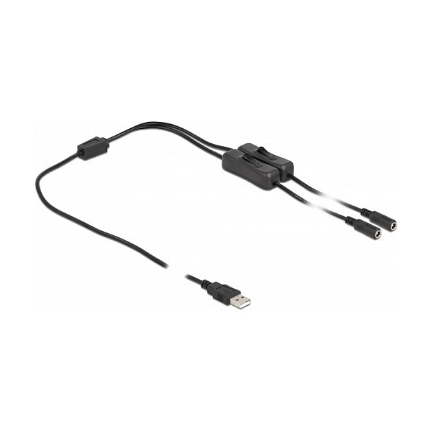 "DeLOCK Cable USB Type-A male to 2 x DC 5.5 x 2.1 mm female with switch 1 m. Cable length: 1 m, Connector 1: USB A"\n"This cable by Delock can be connected to a USB Type-A port in order to supply power to devices with DC plug. By using the single on / off switches the power supply for the connected device can be switched on or off. Therefore it is not needed to remove the cable from the female port to switch off the power supply. The cable can be applied especially for hobby area as well as for tinkerer."