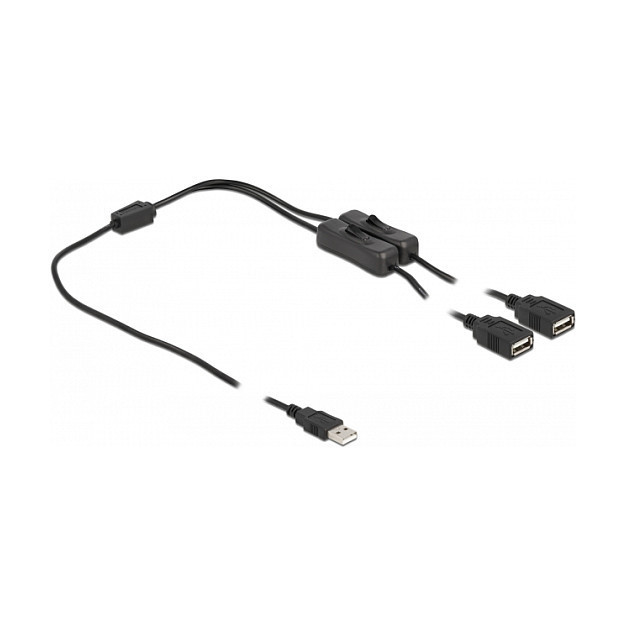 "DeLOCK Cable USB Type-A male to 2 x USB Type-A female with switch 1 m. Cable length: 1 m. Connector 1: USB A, Connector 2: 2 x USB A, USB version: USB 2.0, Product colour: Black"\n"This cable by Delock can be connected to a power source with USB Type-A port in order to supply power to up to two devices with USB Type-A plug. By using the on / off switch the power supply for the connected device can be switched on or off. Therefor it is not needed to remove the cable from the female port to switch off the power supply."