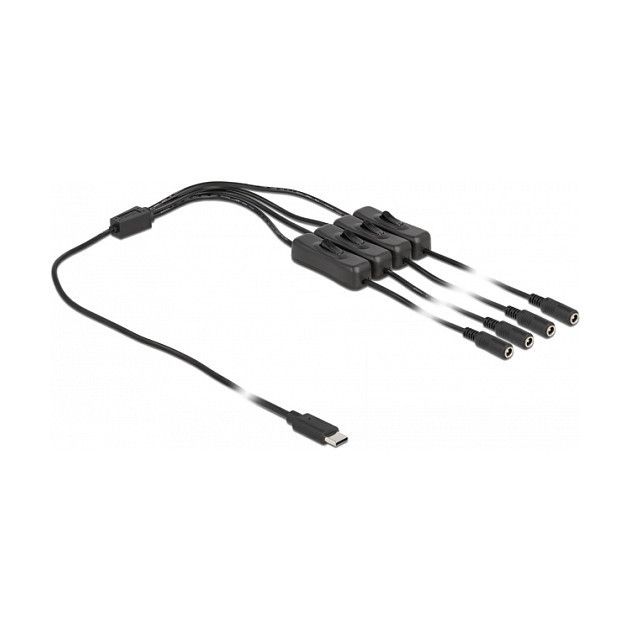 "DeLOCK Cable USB Type-C male to 4 x DC 5.5 x 2.1 mm female with switch 1 m. Connector 1: USB Type-C, Connector 2: 4 x DC 5.5 x 2.1 mm, Cable length: 1 m. Product colour: Black"\n"This cable by Delock can be connected to a USB Type-C™ port in order to supply power to devices with DC plug. By using the single on / off switches the power supply for the connected device can be switched on or off. Therefore it is not needed to remove the cable from the female port to switch off the power supply. The cable can be applied especially for hobby area as well as for tinkerer."