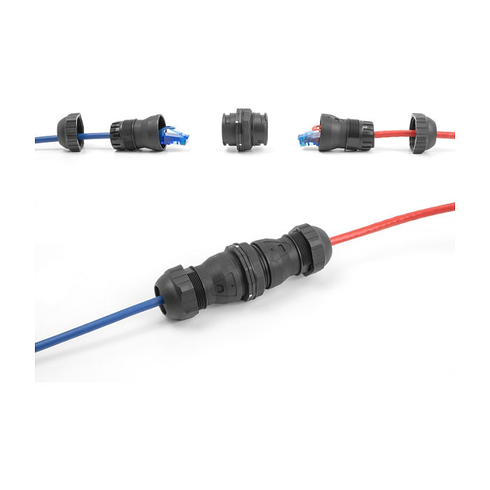 "DeLOCK Cable Connector RJ45 jack to RJ45 jack Cat.6A IP68 dust and waterproof. Connector 1: RJ45, Connector 2: RJ45. Product colour: Black"\n"This cable connector by Delock connect RJ45 network cables and is ideal for outdoor use e.g. in the garden.