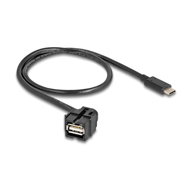 "DeLOCK Keystone Module USB 2.0 A female to USB Type-C male 250° with cable 0.5 m. Cable length: 0.5 m. Connector 1: USB A, Connector 2: USB C, USB version: USB 2.0, Connector contacts plating: Gold"\n"This module by Delock can be used to extend e.g. a USB cable. With its standardised dimensions it can be used for easy snap-in mounting in e.g. a Keystone patch panel, face plate or surface-mount box. The short, angled cable has a small mounting depth and allows a space-saving installation in hard to reach places in equipment or in cable ducts."