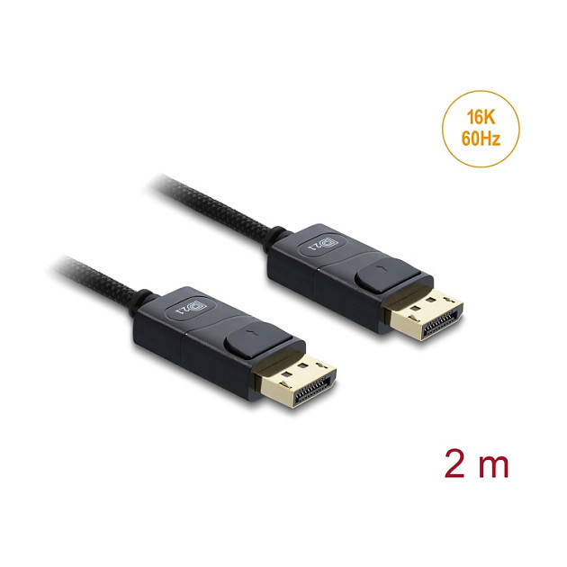 "DeLOCK Coaxial DisplayPort cable 16K 60 Hz 80 Gbps with braided coating 2 m. Cable length: 2 m, Connector 1: DisplayPort, Connector 2: DisplayPort. Cable diameter: 5.4 mm. Package type: Polybag. Quantity per pack: 1 pc(s). Country of origin: China"\n"This coaxial DisplayPort cable by Delock is used to connect devices with a DisplayPort interface, such as monitors, projectors or televisions, to a PC or laptop.