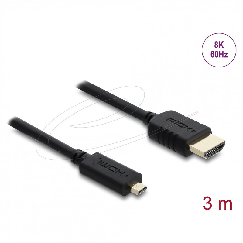 "DeLOCK 81692. Cable length: 3 m, Connector 1: HDMI Type A (Standard), Connector 1 gender: Male, Connector 2: HDMI Type D (Micro), Connector 2 gender: Male, Connector contacts plating: Gold, 3D, Maximum resolution: 7680 x 4320 pixels, Data transfer rate: 48 Gbit/s, Product colour: Black"\n"This High Speed HDMI with Ethernet cable by Delock enables the connection between a camera or tablet with Mini HDMI interface and a monitor or TV with an HDMI port.