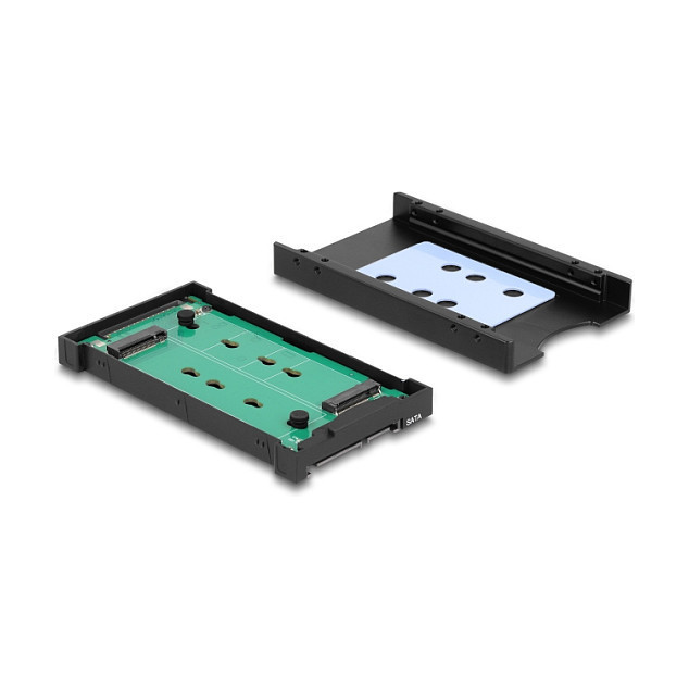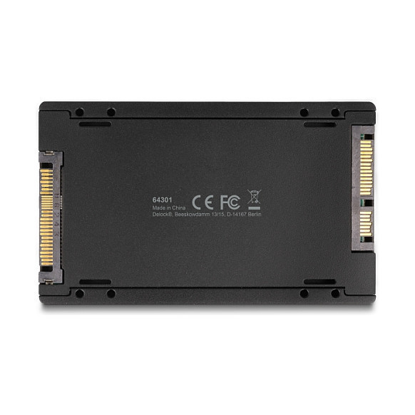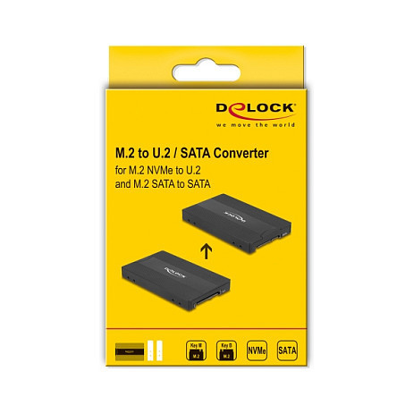 "DeLOCK 64301. Host interface: U.2, Output interface: M.2, Host interface gender: Male. Product colour: Black, Country of origin: China. Width: 70 mm, Depth: 115 mm, Height: 12 mm. Quantity per pack: 1 pc(s), Package type: Hanging box"\n"This converter by Delock enables the installation of an M.2 PCIe NVMe SSD with key M or SATA M.2 SSD with key B in 2280, 2260, 2242 and 2230 format. When using a NVMe SSD, the converter is connected to the U.2 interface, connected to the SATA interface when using a SATA SSD.