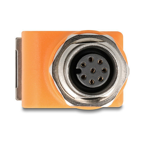 Delock M12 Adapter A-kodiert 8 Pin Buchse zu RJ45 Buchse Cat.5e mit Befestigungsloch 90° gewinkelt orange