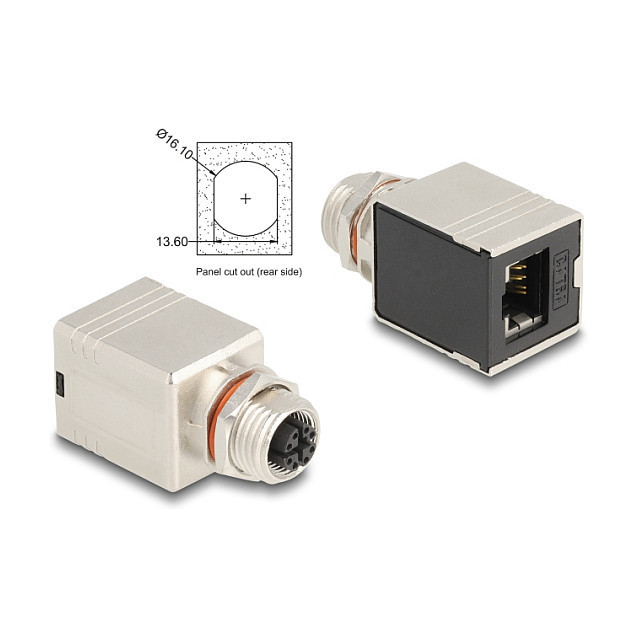 "DeLOCK M12 Adapter X-coded 8 pin female to RJ45 jack Cat.6A STP shielded straight. Connector 1: M12, Connector 2: RJ45, Connector contacts plating: Gold. Product colour: Black, Metallic"\n"This industrial Ethernet adapter by Delock can be used to connect various components with M12 connectors, e.g. for machine control or automation.