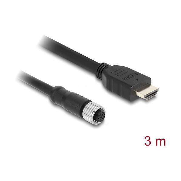 "DeLOCK M12 Cable A-coded 17 pin female to HDMI male 3 m black. Cable length: 3 m, Connector 1: M12, Connector 2: HDMI. Package type: Polybag"\n"This M12 connection cable by Delock is specially designed for industrial applications where HDMI signals must be transmitted reliably and safely, e.g. in image processing systems, industrial cameras, displays, mobile machines or industrial PCs with HDMI output in machines."